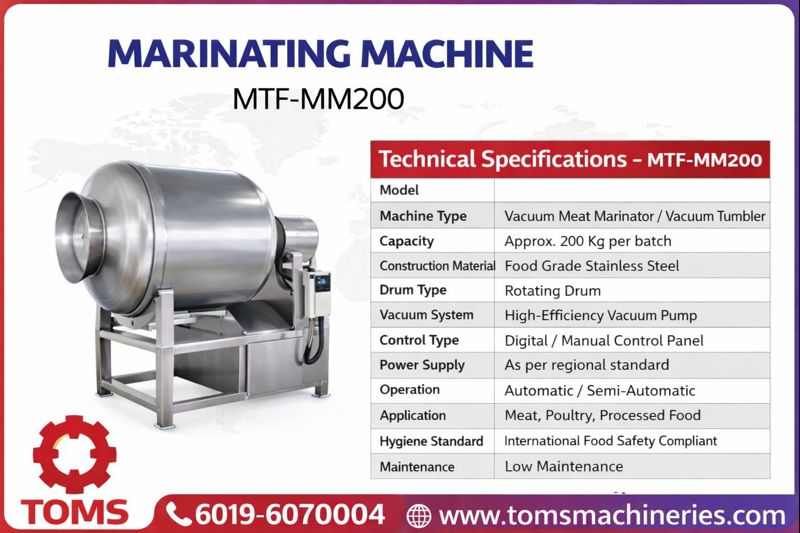 Energy-efficient and low-maintenance, the MM200 is engineered for continuous industrial use, helping businesses deliver premium-quality marinated meat while reducing labor and operating costs.